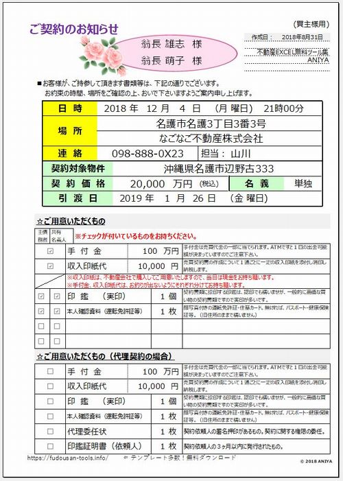 おすすめ!きれいで見やすいご案内状で契約前に安心感を”ANIYA【契約後】01.ご契約のお知らせ”【不動産EXCEL無料テンプレート】