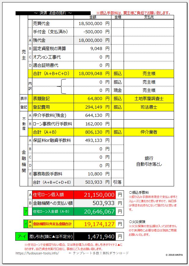おすすめ!不動産取引最後のお知らせ。支払い関係を1円単位でまとめたご案内状です。”ANIYA【契約後】04.決済(お引き渡し)のお知らせ”【不動産EXCEL無料テンプレート】