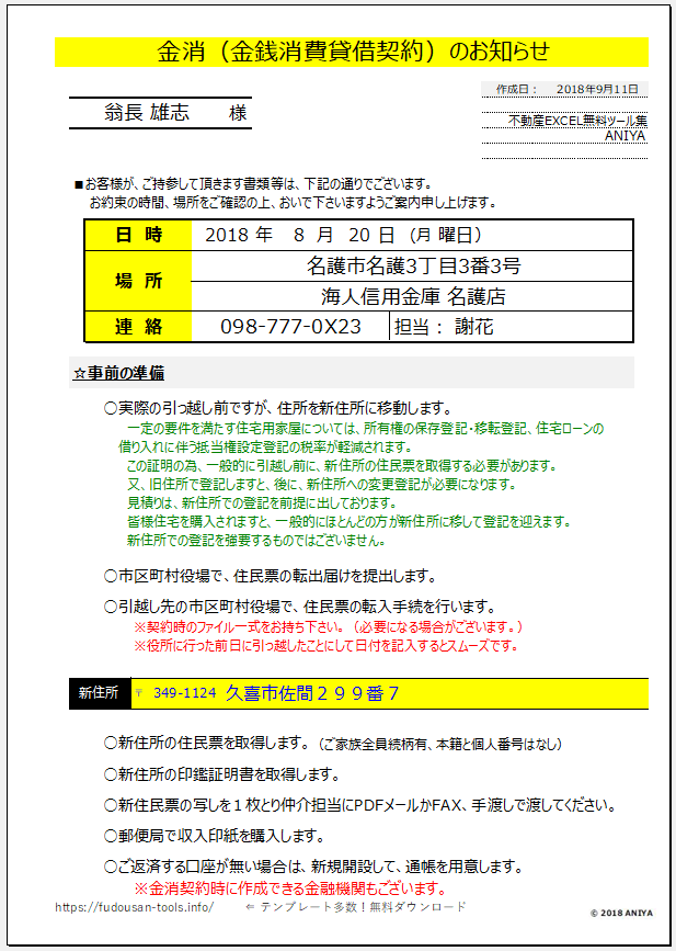 おすすめ!契約後お客様にとって一番重要なイベント住宅ローンの契約のご案内です。金消(金銭消費貸借契約)のお知らせ【不動産EXCEL無料テンプレート】