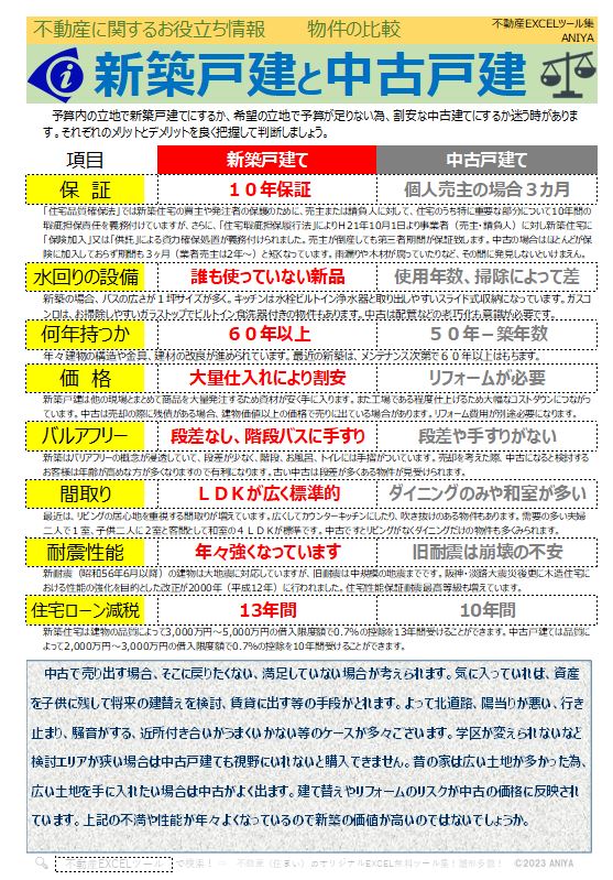 おすすめ!不動産の現在の新築と中古はどっちがお得?”【役立情報】新築戸建と中古戸建”【不動産EXCEL無料テンプレート】