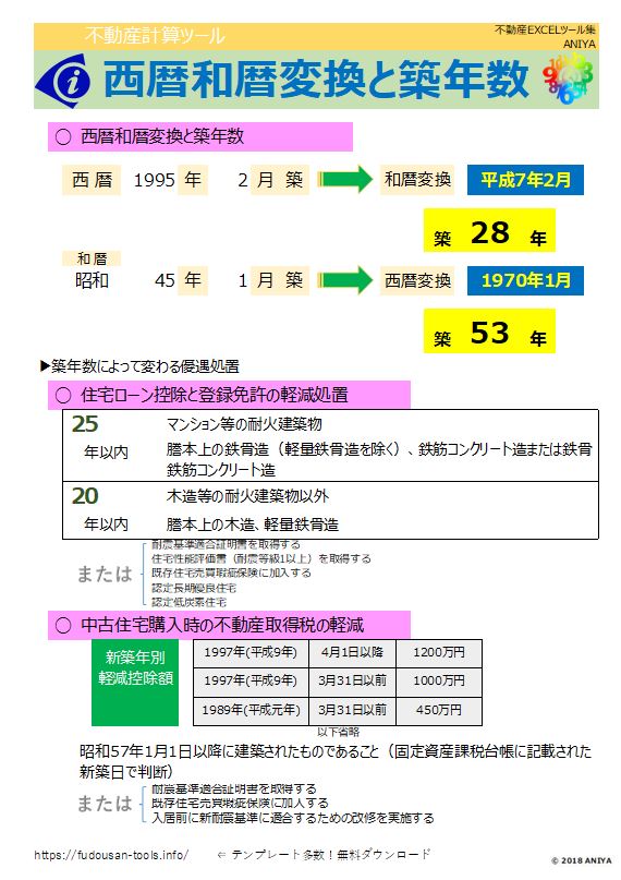 おすすめ!販売図面の統一されていない築年数表記の西暦和暦変換と税の優遇で大切な築年数を表示”ANIYA【不動産計算ツール】西暦和暦変換と築年数”【不動産EXCEL無料ツール】