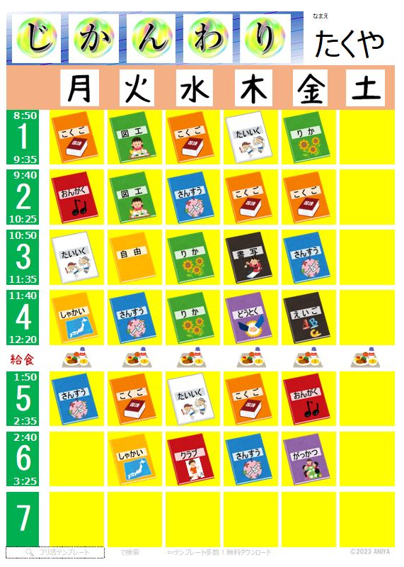 ゲームではないのですが、お子様向けの時間割作成シートを作ったので掲載します。