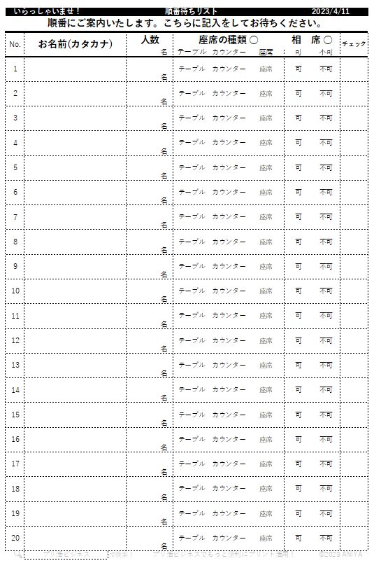 レストランの順番待ちシート