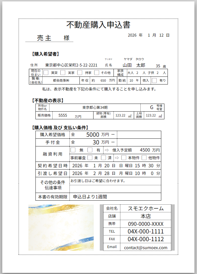 不動産購入の意志を売主様に伝える「購入申込書」、買付証明書になります。